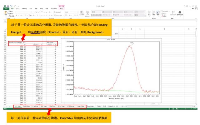 XPS高分辨谱的原始数据一般为“.xls”文件,打开该文件,我们可以看到各种特定元素的高分辨谱及对它们进行半定量分析的原始数据。如图1所示: