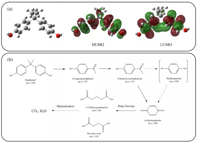 然而,也证实了O2•−和非自由基1O2的作用。这种自由基与非自由基的协同作用受环境因素的干扰较小。DFT和LC-MS结果显示,苯环和酚羟基易受ROS攻击,导致BPA逐渐降解为单链化合物,直至完全矿化。