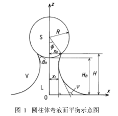 取一个圆柱体 ( 平板 ) 作为测试固体 , 水平放入液体中 , 再慢慢提起来 , 在柱体下面两侧形成一对二维弯液面 , 当柱体上升至某一临界高度时 , 两个弯液面最窄的部分相互接触 , 弯液面破裂。在临界高度HBer 与接触角θ之间存在一定关系 :