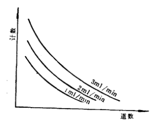 值得注意的是含甲烷的氦气的供给问题。因氮气价格较贵,为了减少该混合气的消耗,一般采用慢流速供气法。混合气体从钢瓶流出,经减压后通过针阀进入探测器,从探测器出来再经缓冲瓶排出。探测器内压力和气体流速可通过针阀和出气孔两处调节。一般使用这种方法时把气体流量缩小至0.5 cm3 / min仍能保证探测器稳定地工作。如不加控制或流速不稳定将使气体密度变化而导致转换电子能谱曲线不稳定,这对反映表层深度的电子能谱区段的解释是不利的。常常因为气体流速的改变影响测试结果的一致性,因此控制气体流量是很重要的。图1给出气体流速与能谱曲线的关系图。