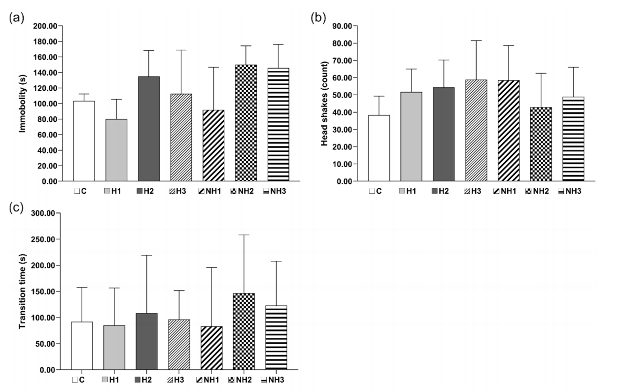 图1 行为测试:(a) Porsolt测试:平均静止时间;(b) Porsolt测试:平均摇头次数;(c)定向和空间记忆测试:通过迷宫的平均时间转换。