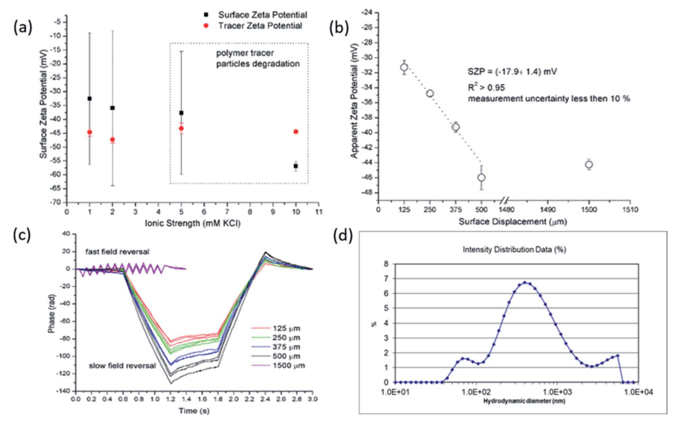 图1 使用乳胶示踪剂颗粒对反渗透膜进行EOF测量得到的SZP是离子强度的函数(a)。在2 mM KCl中不同位移时的典型表观zeta电位(b)和相应的相图(c)。在5 mM离子强度下EOF测量后乳胶示踪剂颗粒的尺寸分布(d)。