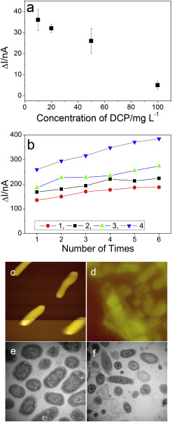 图1。(a)只加入二氯丙醇作为外源物质的 ΔI。(b)连续六个毒性测试循环,交替加入 GGA 和 GGA + DCP,1至4表示连续四天的 GGA 讯号。新鲜微生物(c 和 e)的原子力显微镜和透射电镜图像,并用于毒性测定(d 和 f)。