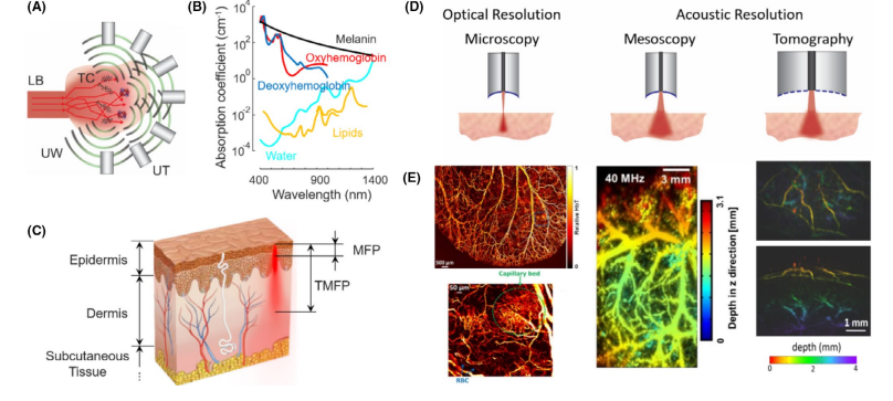 皮肤光声成像的基本原理(图1A)在于其巧妙利用了“光激发-声检测”机制: