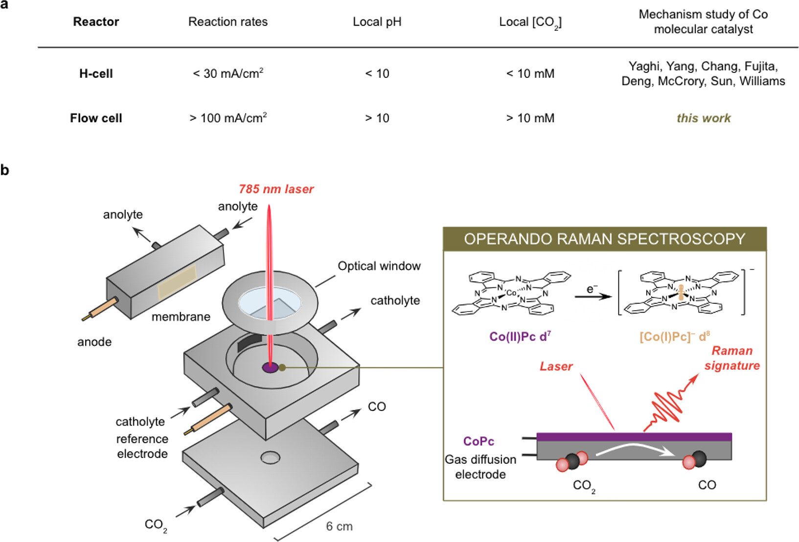 图1 在流动电池条件下分子电催化剂的 Operando 拉曼光谱学测量。(a)在 H 细胞中进行的操纵波谱学研究的摘要。(b)定制的拉曼光谱学电化学流动电池,能够用固定的分子电催化剂对 CO2rR 活性物质进行 operando 检测。