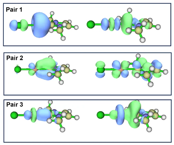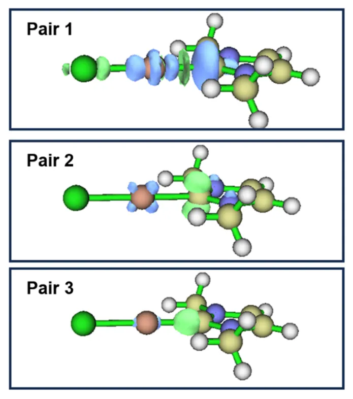 容易发现,轨道对1~3分别对应了Ag与NHC之间形成的2种σ键和1种π键。其中Pair1由Ag的sp杂化轨道与NHC的sp²孤对电子构成,Pair3则主要由Ag的dz2轨道贡献,而Pair2则对应Ag的d轨道与配体π*构成的反馈π键。虽然有三组相互作用,但三者的强度相差悬殊,Pair1的能量贡献占据了绝大多数,Pair2和Pair3的能量贡献加起来也只有Pair1的1/3左右,因此可以知道,在这个NHC配合物中,Ag和配体主要形成σ键,反馈作用比较微弱,这也和较弱的键级相符合。