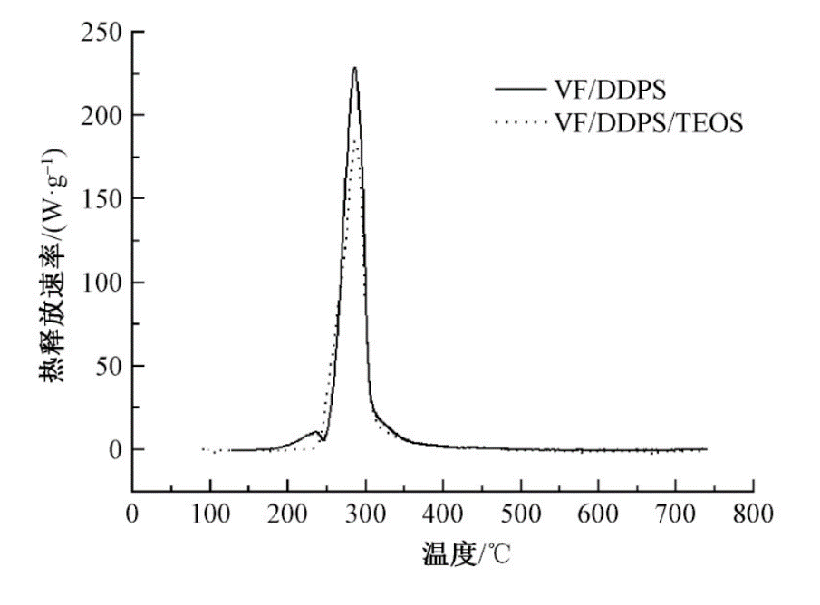 图1. 微型量热仪测试的TEOS阻燃改性前后纤维的燃烧性能曲线[1]