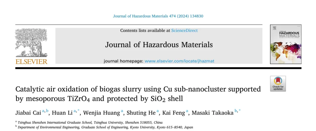 Catalytic air oxidation of biogas slurry using Cu sub-nanocluster supported by mesoporous TiZrO₄ and protected by SiO₂ shell. Journal of Hazardous Materials, 474, 2024, 134830. DOI: 10.1016/j.jhazmat.2024.134830