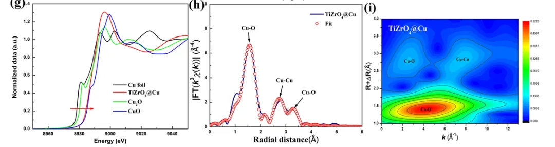 图1g展示了Cu K边的X射线近边吸收结构(XANES)谱,其中包括TiZrO₄@Cu催化剂与三个标准样品(Cu foil、Cu₂O、CuO)的对比曲线。