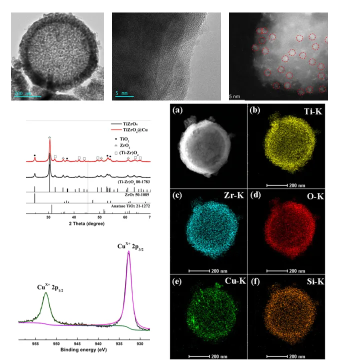 结构设计创新:首次实现Cu亚纳米团簇负载于TiZrO₄中空结构,并包覆超薄SiO₂层,形成三层异质结构;
