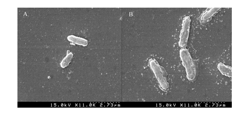 图 1 蜡样芽孢杆菌 ATCC 13061 的扫描电子显微镜照片。 (A):未经处理的蜡样芽孢杆菌;(B):用浒苔精油处理的蜡样芽孢杆菌[1]