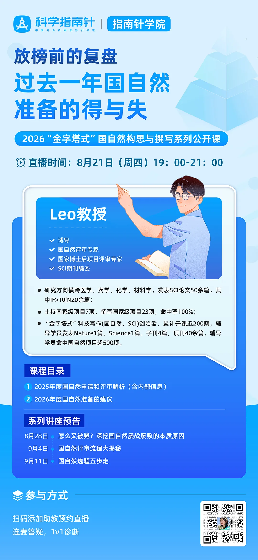 【摘要】 加入科学指南针学院2026国自然系列课程!8月21日免费直播公开课复盘2025申请得失,9月杭州线下强化班深度解析“金字塔式写作法”。国自然评审专家Leo教授亲授,覆盖选题策略、AIGC辅助、评审标准等14大专题,命中率100%实战经验。扫码预约直播,抢占早鸟优惠!