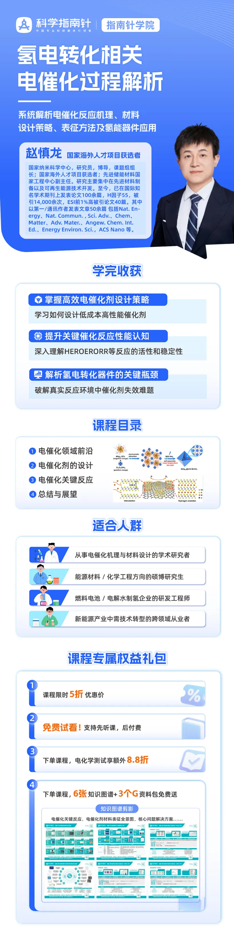 【摘要】 科学指南针深耕电化学领域,提供覆盖储能、氢能、光电等方向的一站式服务,包括方案设计、测试检测和数据分析技术支持。课程《氢电转化相关电催化过程解析》系统解析电催化前沿动态、核心反应机理与催化剂设计策略,帮助掌握高效电催化剂设计,提升氢电转化器件性能认知。限时优惠价299元(原价599元),新客立减500元,支持扫码免费试听先听后付。
