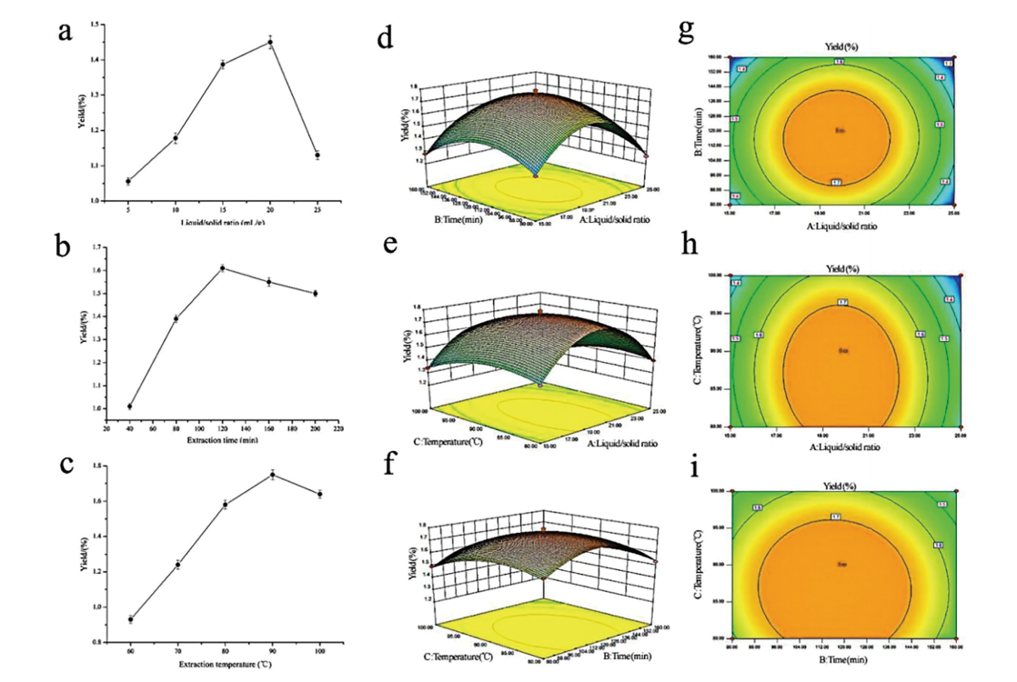 图 1 提取变量对 M. dauricum 根茎多糖产量的影响;响应曲面图和等高线图[1]。