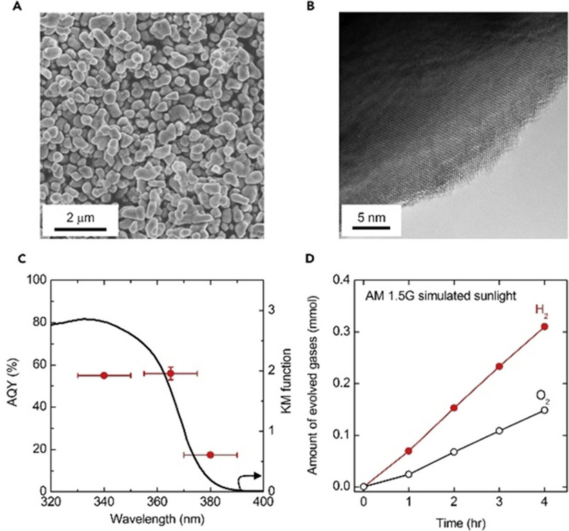 图1 A) SrTiO3: Al 的 SEM 图像; B) RhCrOx/SrTiO3: Al 的 HR-TEM 图像; C) SrTiO3: Al 的表观量子产额(AQY)作为入射光波长的函数。黑色实线表示 SrTiO3: Al; D)在模拟阳光(AM 1.5 G)下,以 RhCrOx (Rh 0.1 wt% ,Cr 0.1 wt%)为助催化剂,从 SrTiO3: Al 纯水中析出气体的漫反射光谱。反应在288K 和10kPa 下进行