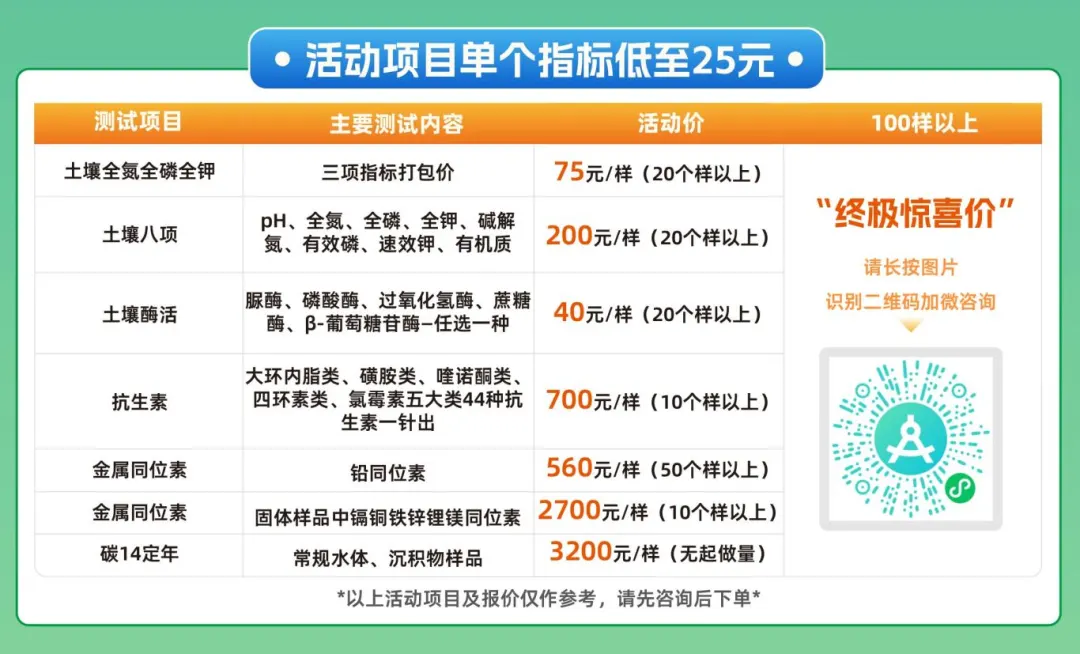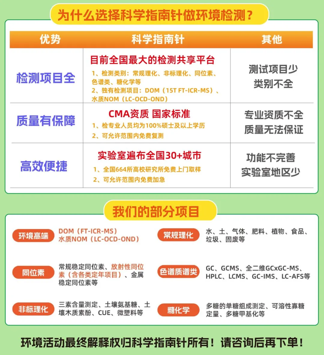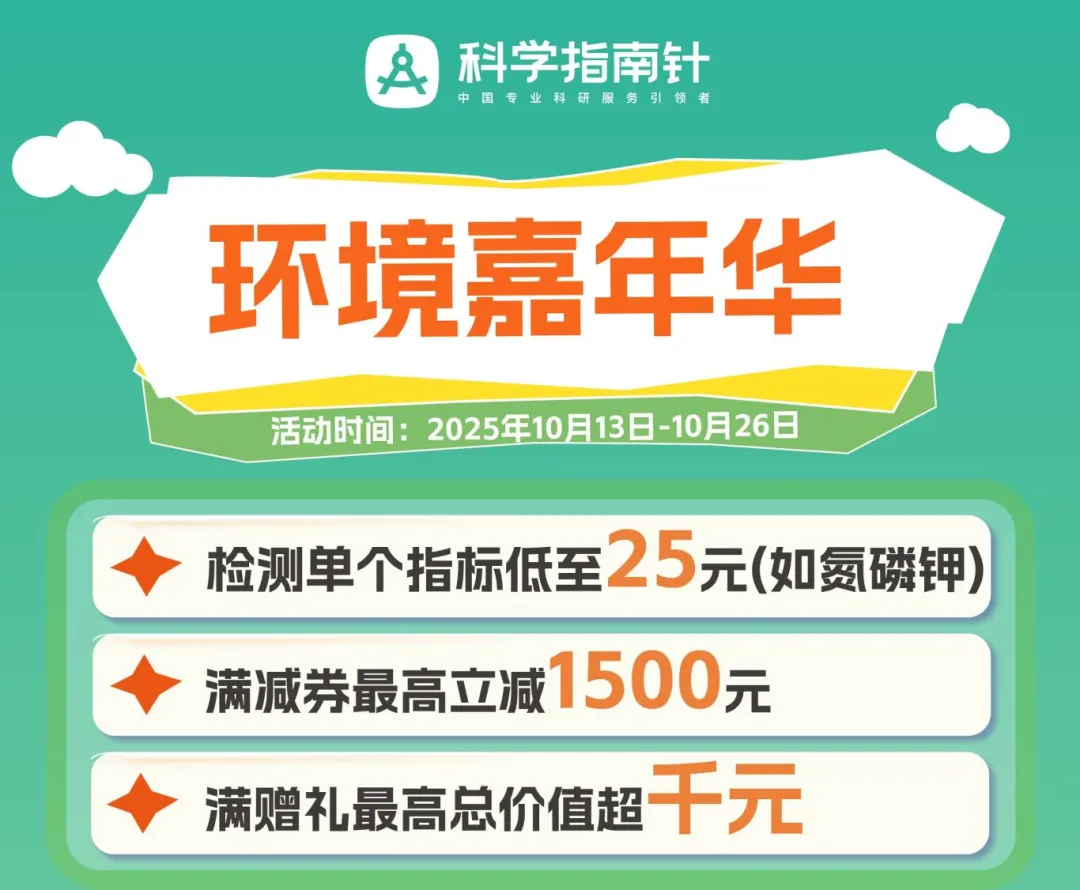 【摘要】 科学指南针2025环境嘉年华盛大开启!2024年10月13日-26日,环境检测单个指标优惠价低至25元(如氮磷钾),参与满减活动最高立减1500元,或参与满赠活动赢取千元好礼。涵盖土壤、水质、同位素等全类别检测项目,CMA资质保障,全国免费上门取样。