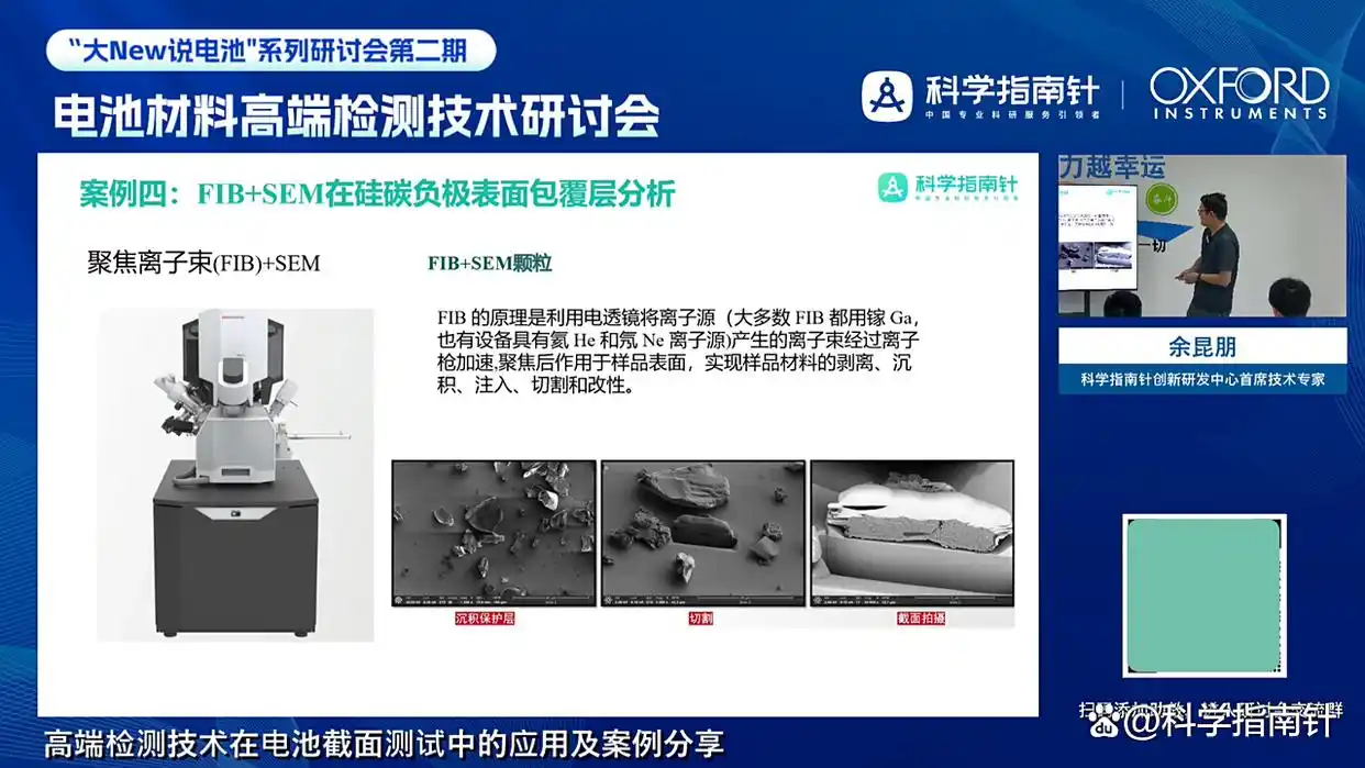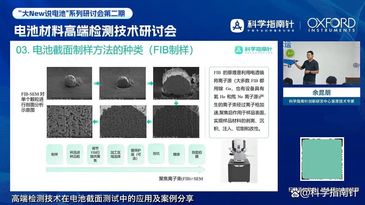 余昆朋老师在分享中,以电池材料微观结构分析为核心,从截面制样方法到微观成像技术,系统拆解了不同技术的适配场景、核心优势及应用注意事项,为精准解析电池材料性能与结构关联提供全流程技术指引。
