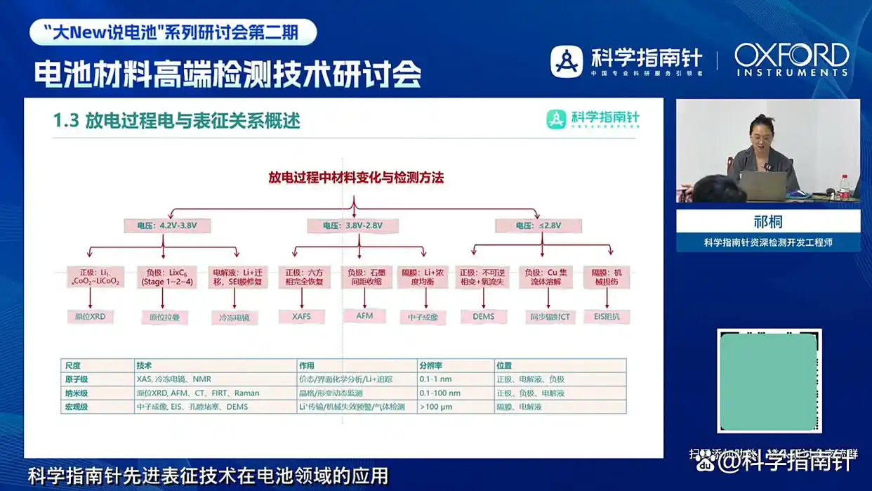 祁桐老师的分享构建了“原子-纳米-宏观”多尺度表征技术体系,明确不同技术在电池材料结构、性能及失效分析中的适配性,为锂电池全生命周期的研发优化、质量管控与安全保障提供了专业技术参考。