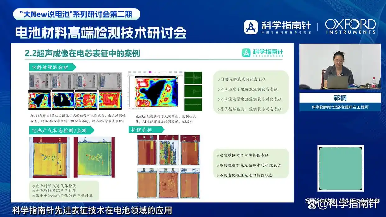 在多尺度形貌表征案例中,她详解了不同技术的应用场景:超声成像凭借无损优势,可监测电解液浸润状态、电池产气及析锂,通过热力图区分样品浸润优劣;