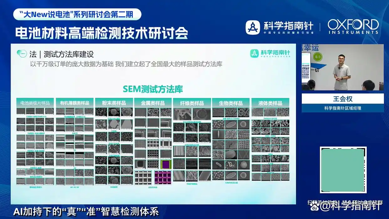 研讨环节,四位专家从材料分析技术在锂电关键材料分析中的不同应用,再到高端检测技术在电池截面测试中的应用及案例等议题进行分享;区域经理王会权老师详细介绍科学指南针 “AI 加持下的‘真・准’智慧检测体系”,围绕技术痛点与行业发展趋势积极互动探讨。
