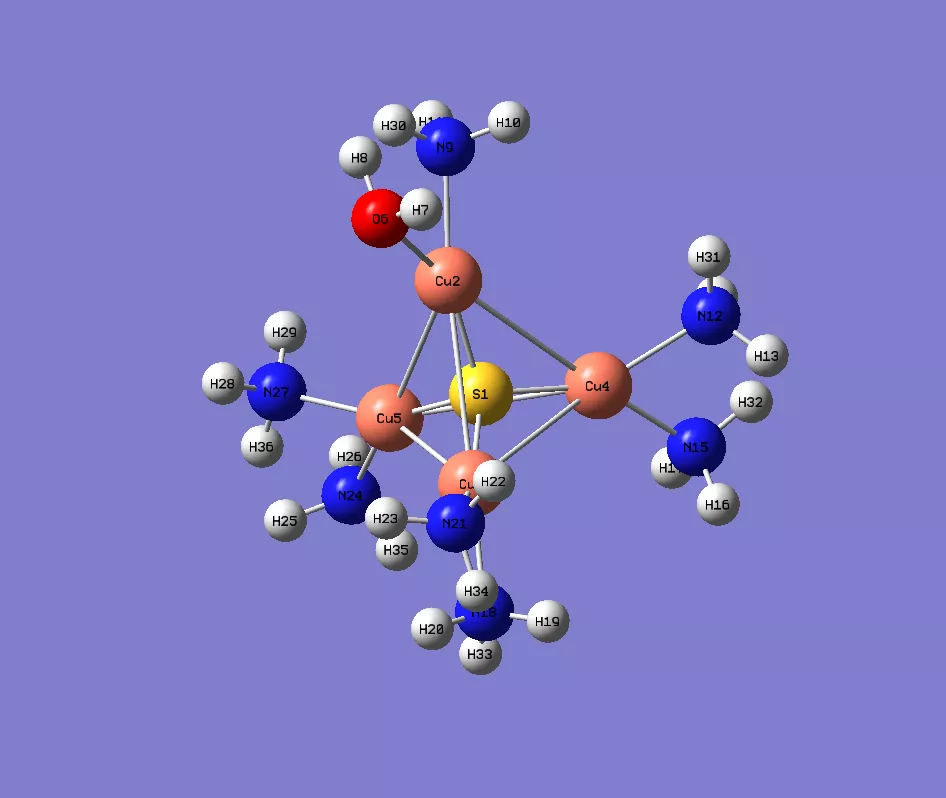 我们首先在GaussView中画出如下的类四面体结构(Cuz_NH3,下同)进行结构优化与频率计算,关键字为: