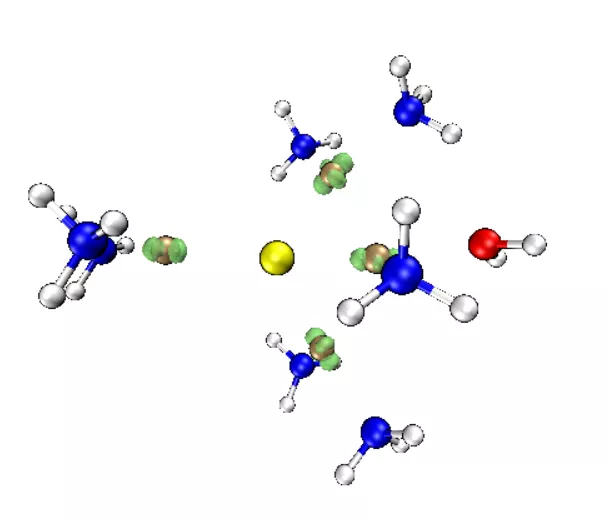随后我们打开VMD程序(http://www.ks.uiuc.edu/Research/vmd/)绘制Cuz_NH3的自旋密度等值面图。此前小编已经将Multiwfn程序包中examples\scripts目录下的VMD脚本showcub.vmd以及上一步我们导出的cube文件spindensity.cub拷贝至VMD目录下(VMD里将cube文件瞬间绘制成效果极佳的等值面图的方法 sobereva.com/483)。