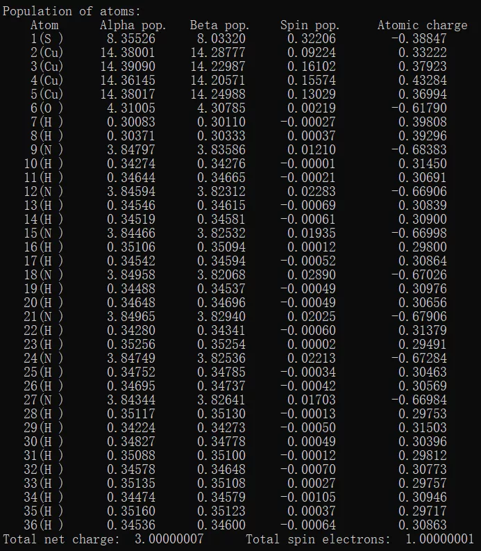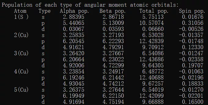 可见,体系总共1个单电子,其中~0.86个集中在S原子和Cu原子上。而上拉至Population of each type of angular moment atomic orbitals一栏,我们可以发现S原子的p轨道贡献了0.31个单电子,而四个Cu原子的d轨道各有0.1-0.2的贡献,在N上只有极少量单电子。