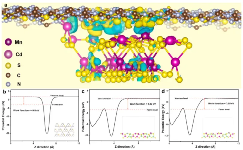 功函数计算揭示能带弯曲机制(S-C₃N₄:4.63 eV,MnCdS:3.92 eV)