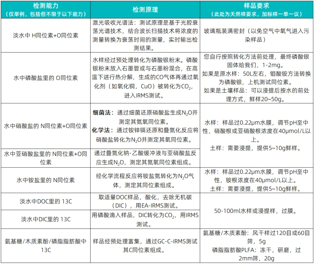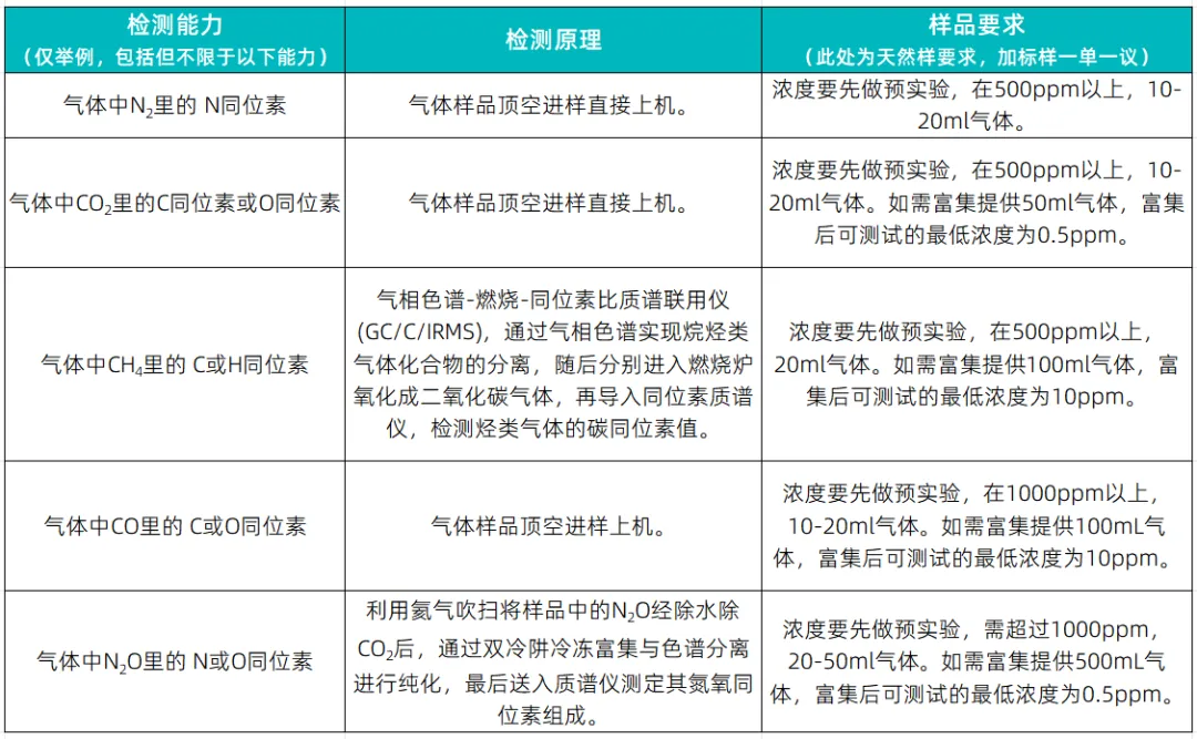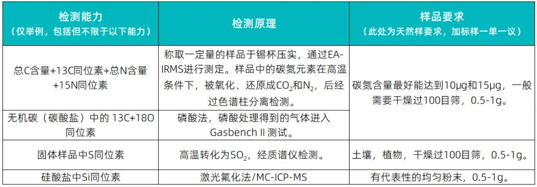 科学指南针提供固体、液体、气体样品的稳定同位素检测服务,技术平台涵盖EA-IRMS、GasBench、GC-C-IRMS等,支持C、H、O、N、S等元素分析。以下为部分检测能力示例: