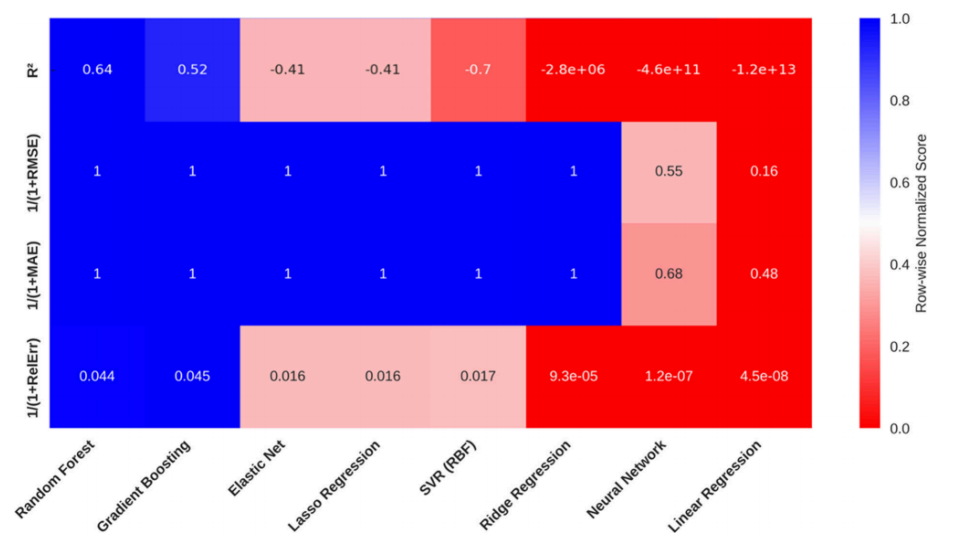 Figure 1:用于预测PFAS扩散系数的机器学习模型性能比较热力图。该热力图展示了不同算法在交叉验证统计下的性能指标,用于模型验证。训练与评估所用的数据集包含48种PFAS化合物。Y轴各行代表经过归一化处理的性能指标:R2分数、1/(1+RMSE)、1/(1+MAE) 以及 1/(1+RelErr)。其中,RMSE指均方根误差,MAE指平均绝对误差,RelErr指相对误差。所有误差指标均通过1/(1+error)公式进行转换,使其与R2的方向性保持一致,从而确保在所有指标中,数值越高均代表性能越好。颜色深度在每个指标内部进行了行归一化处理,以增强视觉对比效果,其中蓝色表示在该性能指标内相对更好的表现。