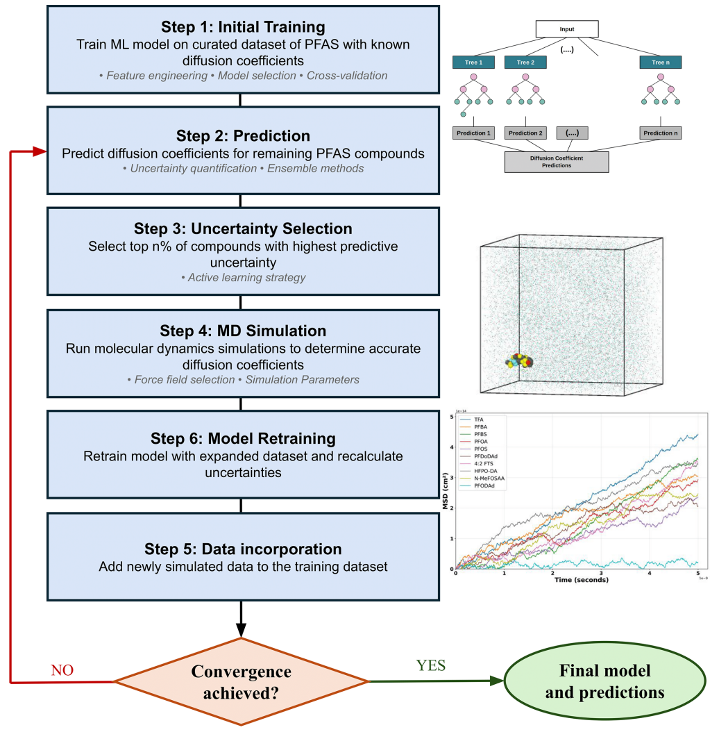 主动学习框架:首次系统性应用不确定性引导的样本选择,优先对预测不确定性高的PFAS分子进行分子动力学模拟,迭代优化模型。