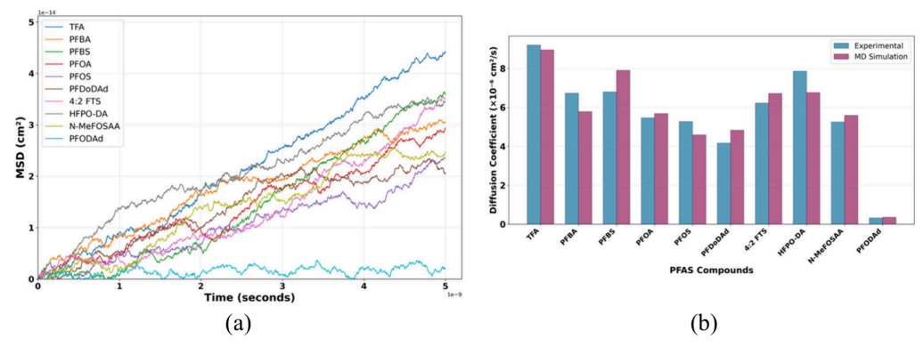 Figure 3:PFAS扩散系数的均方位移分析与分子动力学模拟验证。(a) 均方位移随时间的演变曲线。在扩散区呈现的线性关系证实了模拟系统已达到充分平衡,其斜率通过爱因斯坦关系式与扩散系数直接成正比。(b) 模拟与实验扩散系数之间相对误差的分布图,显示平均相对误差为12.3%,验证了PFAS分子动力学模拟的准确性。