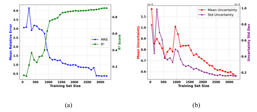 Figure 4:模型性能与不确定性指标在主动学习迭代中的演变。(a) 随训练集规模增加的MRE(蓝色)与R2分数(绿色)变化趋势综合视图。(b) 随训练数据量增加的不确定性均值(红色)与标准差(紫色)改善情况综合视图。