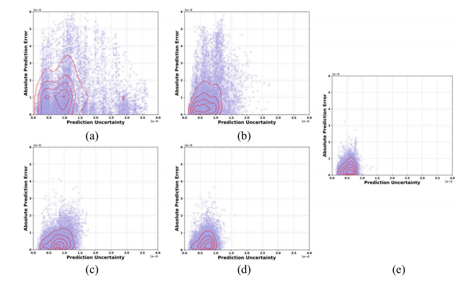 Figure 5:预测不确定性与误差相关性分析。(a)至(e)子图分别展示了第1、7、15、21和33次迭代的散点图,揭示了在验证样本上,模型预测不确定性与绝对预测误差之间的关系。