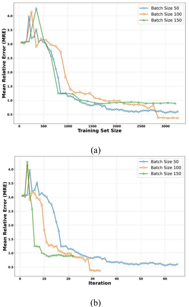 Figure 6:不同批量大小(50、100、150)在主动学习中的平均相对误差收敛对比。