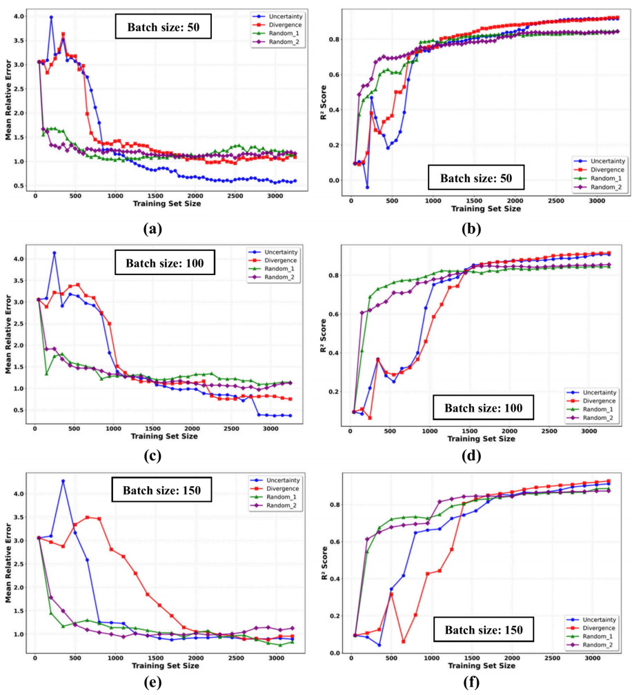 Figure 7:不同批量大小下主动学习策略的性能指标对比。 (a, b) 批量50, (c, d) 批量100, 以及 (e, f) 批量150。(a), (c), (e) 子图分别展示了批量大小为50、100、150时,平均相对误差随训练集规模的变化趋势;(b), (d), (f) 子图则分别展示了相应批量大小下,R2分数随训练集规模的变化趋势。。