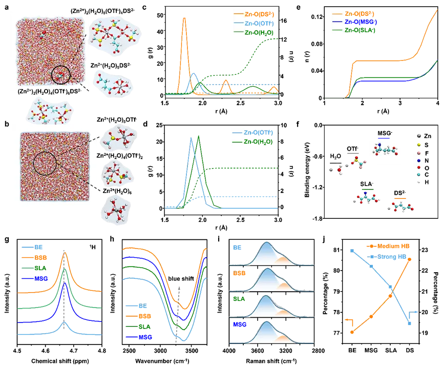 MD模拟单元的3D快照: (a) BSB电解质, (b) BE电解质;MD模拟中收集的RDFs: (c) BSB电解质,(d) BE电解质;(e) 不同添加剂的配位数。(f)Zn–H2O、Zn–OTf-、Zn–DS2-、Zn–MSG-和Zn–SLA-的结合能;不同电解质的 (g) 1H NMR谱图,(h) FTIR谱图;(i) O–H伸缩振动的拉曼光谱;(j) 由拉曼光谱得出的不同电解质中强氢键和中氢键百分比。