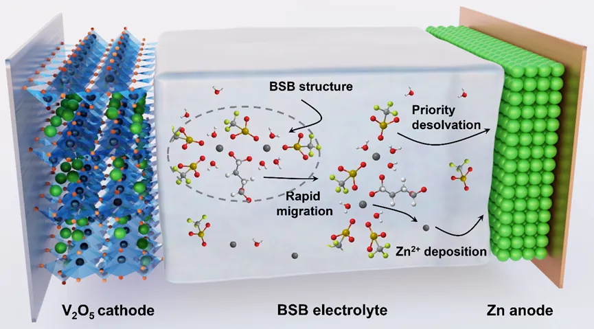 研究团队创新性地提出双螯合溶剂化结构(BSB)设计策略,通过分子结构精准调控实现溶剂化鞘层重构,突破传统锌离子电池性能限制。