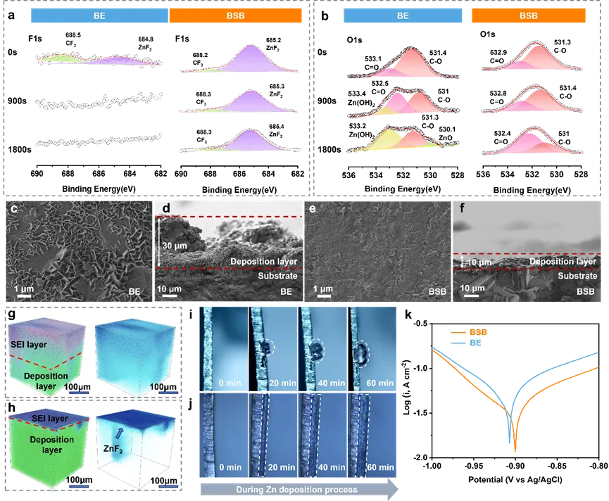 在1 mA cm-2下循环30圈:(a) BE电解质和 (b) BSB电解质中不同刻蚀时间的XPS谱图;BE电解质中的SEM图像 (c) 平面图和 (d) 截面图;BSB电解质中的SEM图像 (e) 平面图和 (f) 截面图;TOF-SIMS图:(g) BE电解质和 (h) BSB电解质;锌负极的原位光学显微镜观察:(i) BE电解质和 (j) BSB电解质;(k)不同电解质的塔菲尔曲线。