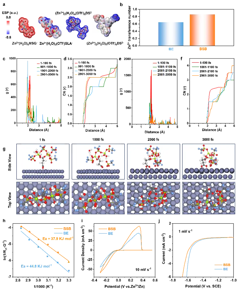 (a) 不同溶剂化结构的静电势映射图;(b) BE电解质和BSB电解质中Zn2+迁移数的比较;通过AIMD模拟(Zn2+)2(H2O)5(OTf-)4DS2-的去溶剂化过程: 0–3000 fs内H2O去溶剂化过程的 (c) RDF和 (d) 配位数,0–3000 fs内OTf-去溶剂化过程的 (e) RDF和 (f) 配位数;(g) 相应的模拟快照;(h) 不同电解质的活化能;(i) CV曲线;(j) LSV曲线。