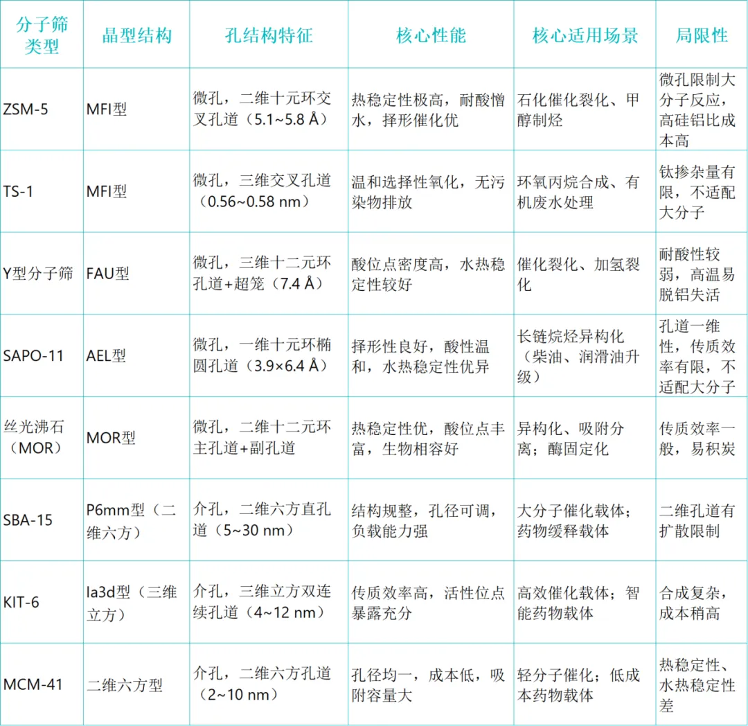 为了方便大家快速选型,整理了包含晶型结构、孔结构、性能等核心维度的对比表,关键信息一目了然: