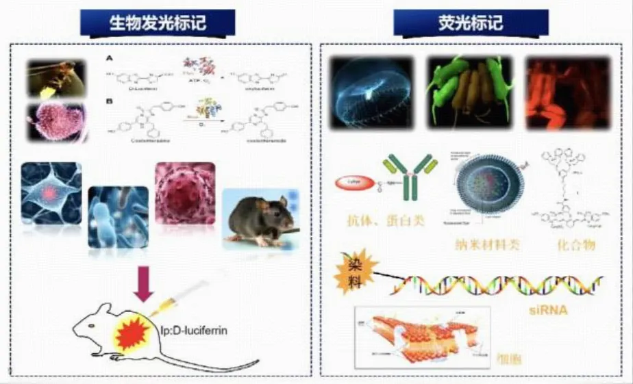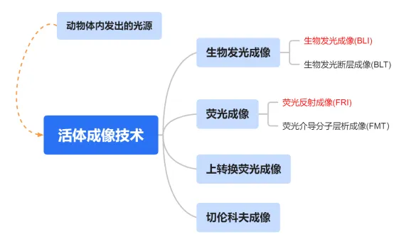 根据动物体内发出的光源,光学成像可进行生物发光成像(Bioluminescence imaging,BLI)、荧光成像(Fluorescence imaging,FI)。
