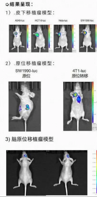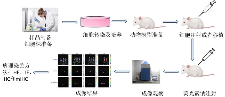一个完整的生物发光活体成像过程包括构建荧光素酶重组质粒、细胞转染和筛选、荧光素酶活性鉴定阳性克隆,再将阳性克隆细胞移植到体内建立动物模型,进而通过小动物活体成像系统检测动物体内特定部位发出的荧光信号。最后取出肿瘤组织,通过染色进行病理形态学分析。