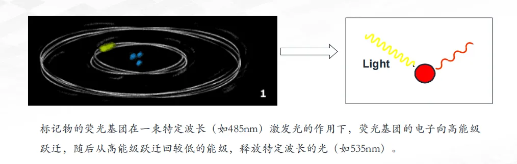 荧光发光原理是通过使用荧光染料、探针或荧光蛋白,在特定波长的激发光照射下,发射出波长大于激发光波长的荧光信号。这种技术依赖于荧光基团在受到激发后,电子从基态跃迁到激发态,然后返回基态时释放能量,产生荧光。