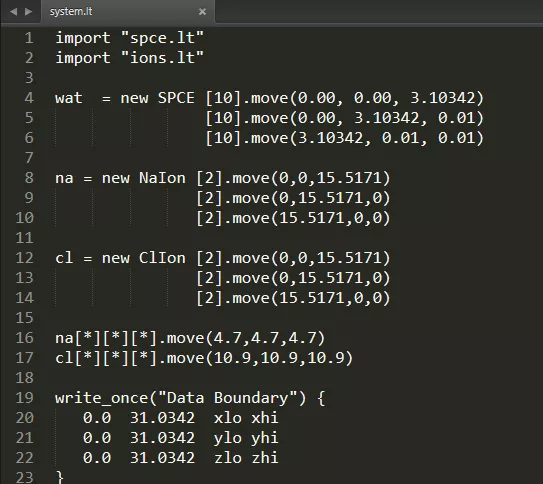 system.lt:1-2行导入了之前的两个lt文件;4-6行以SPCE水分子为模板创建了1000个SPCE水分子并进行了平移操作;8-10行以NaIon分子为模板创建了8个NaIon并进行了平移操作;12-14行以ClIon分子为模板创建了8个ClIon并进行了平移操作;16-17行对所有NaIon、ClIon分子进行了附加的平移操作防止与水分子重叠;19-23行定义了x、y、z三维方向上的范围,即确定模拟体系的空间范围。