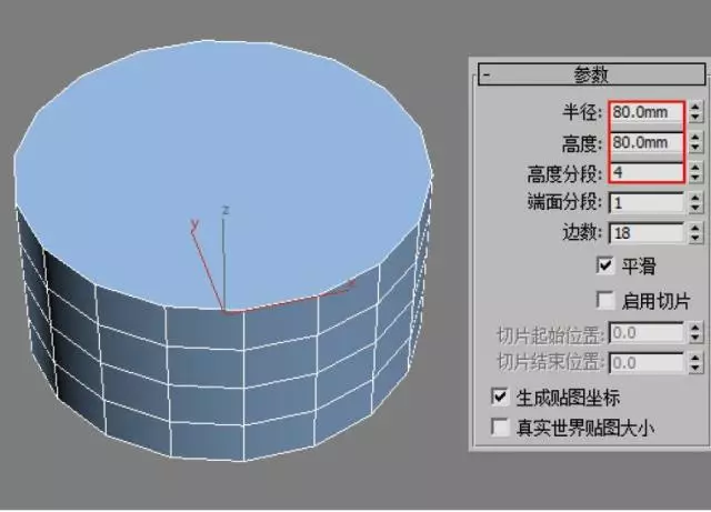 首先来制作面盆模型。使用“圆柱体”工具在场景中创建一个圆柱体,然后在“参数”卷展栏中设置“半径”为80mm、“高度”为80mm、“高度分段”为4,如图所示。
