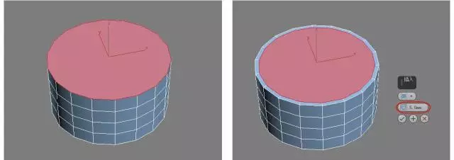 选择上一步创建的圆柱体,将其转换为可编辑多边形,然后进入“多边形”层级,选择左图所示的多边形。接着在“编辑多边形”卷展栏下单击“插入”按钮后面的“设置”按钮,最后设置“数量”为5mm,如右图所示。