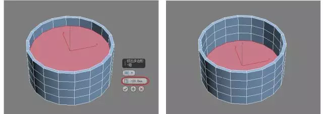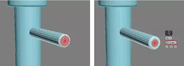 将上一步创建的切角圆柱体转换为可编辑多边形,然后进入“多边形”层级,选中左图所示的多边形,接着在“编辑多边形”卷展栏中单击“插入”按钮后面的“设置”按钮,最后设置“数量”为1mm,如右图所示。