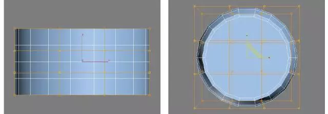 然后切换到“控制点”层级,在前视图中框选左图所示的控制点, 接着在顶视图中使用“选择并均匀缩放”工具在xy平面进行放大,如右图所示。