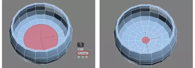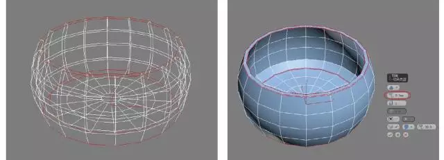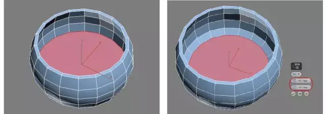 此时可以观察到模型底部的分段很少,再次将模型转换为可编辑多边形,然后进入“多边形”层级,选中左图所示的多边形,接着在“编辑多边形”卷展栏下单击“倒角”按钮后的“设置”按钮,接着设置“高度”为-10mm、“轮廓”为-10mm,如右图所示。